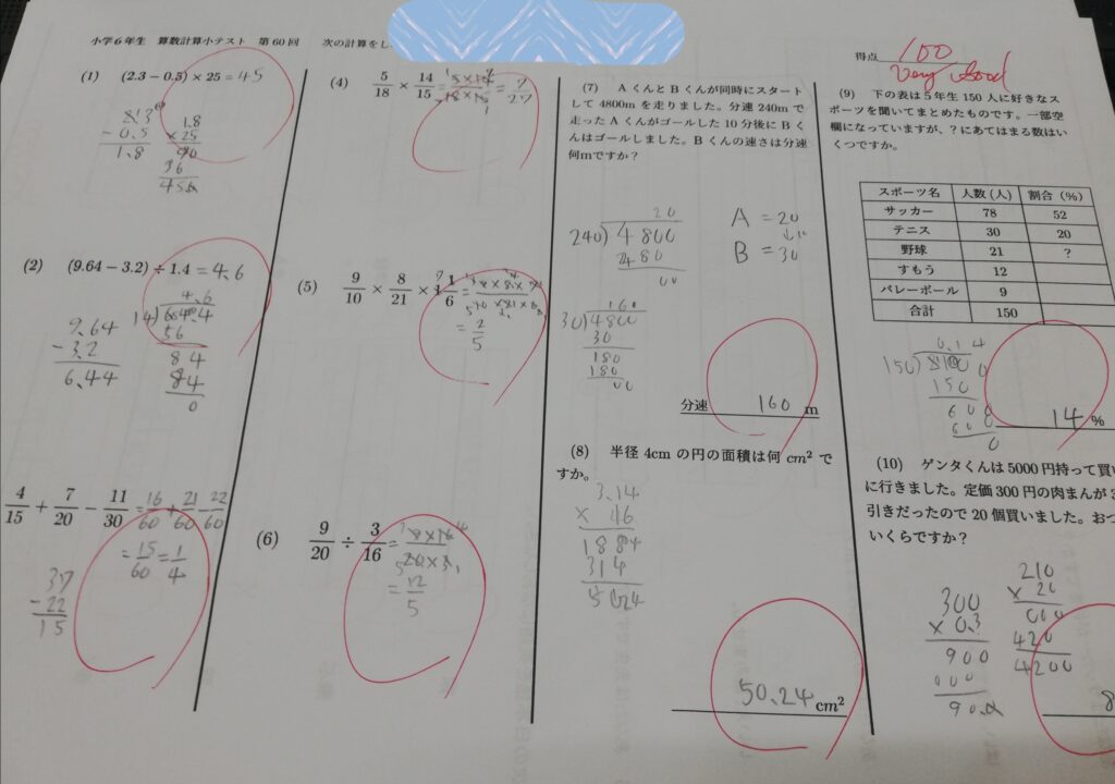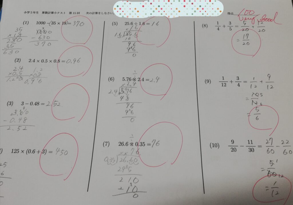 5年生にしては丁寧な字でよろしいです。字が雑だと途中式が長くなる中学の計算で、自分の字が読めなくて間違えるという事態になりかねません。撮影用に100点のを使いましたが、この時の塾生の平均は80点で毎回平均点は70点~80点くらいです。今後、平均・速さ・割合の単元に入ると文章題も出題することになるでしょう。