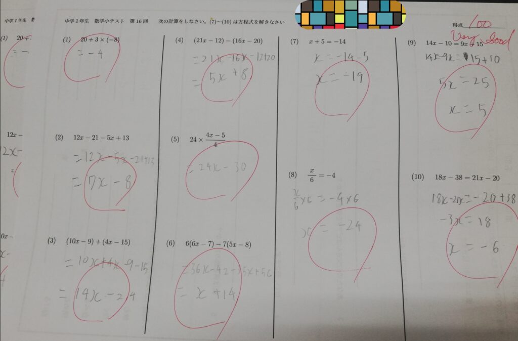 これは少々前のテストですが、現在一次方程式を習っているから一次方程式の問題だけ、というわけではなくその前に習っている数の計算や、文字式の計算もあわせてチェックします。塾では一次方程式の計算はほぼ終了したところで学校よりは少々先に進んでいると思います。なにしろ夏休み期間もずっと取り組んでいたので、週2のわりには学校よりも塾で習っている時間の方が長いと思います。