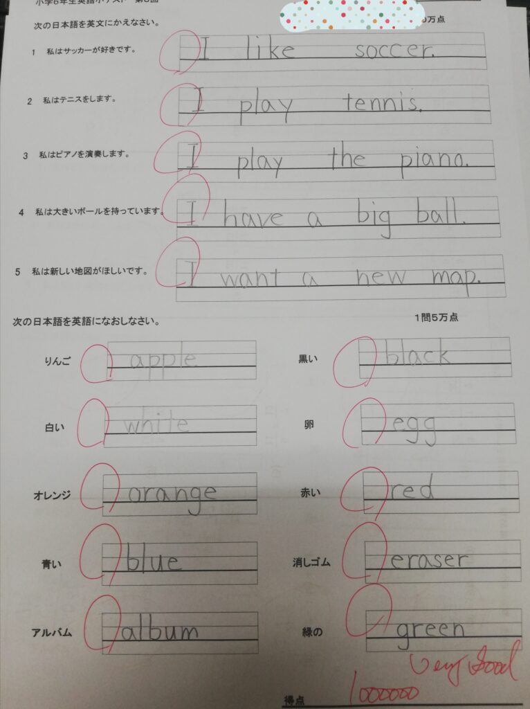6年生も5年生同様授業開始時に小テストを行っています。算数の計算テストと英語の文章&単語のテストです。計算はやはり先を見据えたものです。中学では計算はできて当たり前、さらに高度な内容に取り組みますので小学校の計算ができないようでは数学で苦労します。よって塾生の皆さんには中学で苦労しなくていいように計算力はつけさせたいと考えています。英語はまだ始めて3か月くらいですから、基本的な構造の文章です。これも練習しないと書けないでしょうから、テストを見れば塾生の皆さんが家でどれくらい勉強しているか分かります。